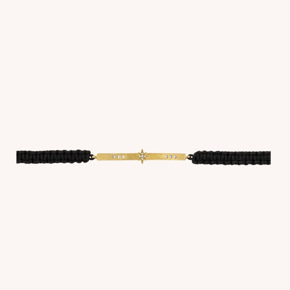 Le bracelet DIWALI LINK de MYA BAY est un bijou raffiné qui associe symbolique et modernité. Doré à l’or brosséet monté sur un cordon noir ajustable, il incarne l’élégance discrète propre à la maison.