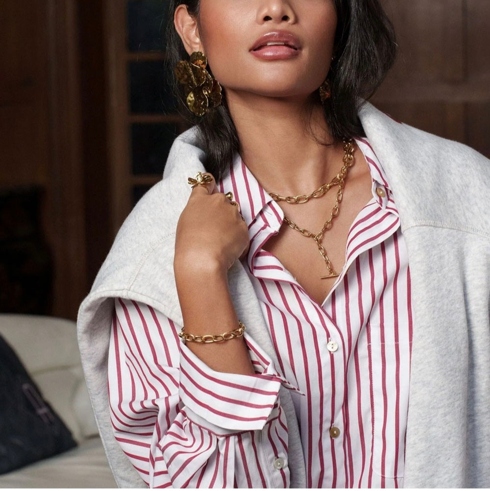Une pièce tendance et affirmée grâce à sa maille composée d’anneaux ovales lisses et striés. Ce bracelet mêle modernité et élégance, avec un jeu de textures qui accroche la lumière. Un bijou fort, mais facile à porter au quotidien.
