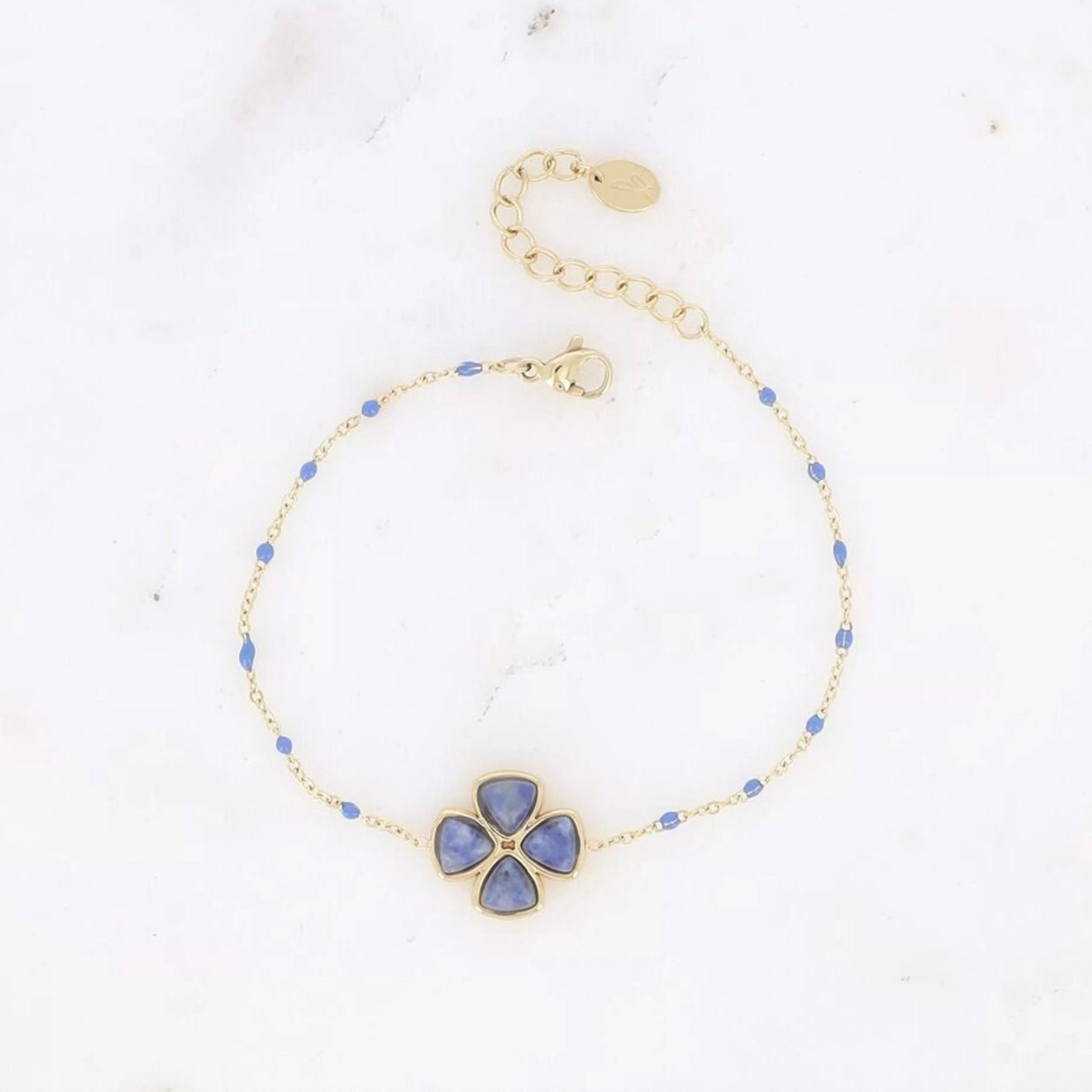 Bracelet sur chaîne en acier inoxydable composé d'un pendentif en forme de trèfle à 4 feuilles en pierre naturelle cornaline et d'une chaîne aux touches en émail.