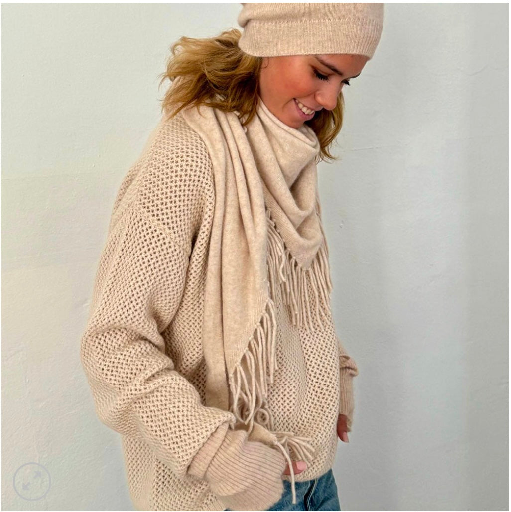 Sa forme triangulaire oversize, bordée de franges délicates, lui confère une allure à la fois chic et décontractée — parfaite pour envelopper vos tenues d’une touche de chaleur et d’élégance.