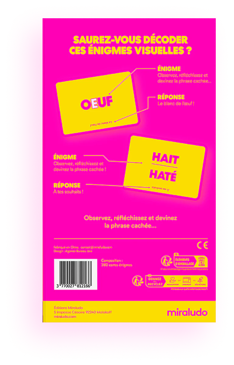 Face à toi, des mots et des images arrangés de façon étrange… mais qui cachent une expression, un titre ou un proverbe. À toi de décrypter ces dingbats, ces petites énigmes graphiques où tout est indice.