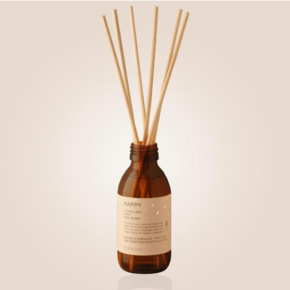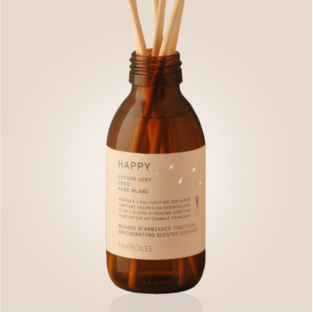 Apportez énergie et bonne humeur à votre intérieur avec le Mikado d’ambiance Happy*. Son parfum acidulé et pétillant transforme votre maison en véritable pool party olfactive.
