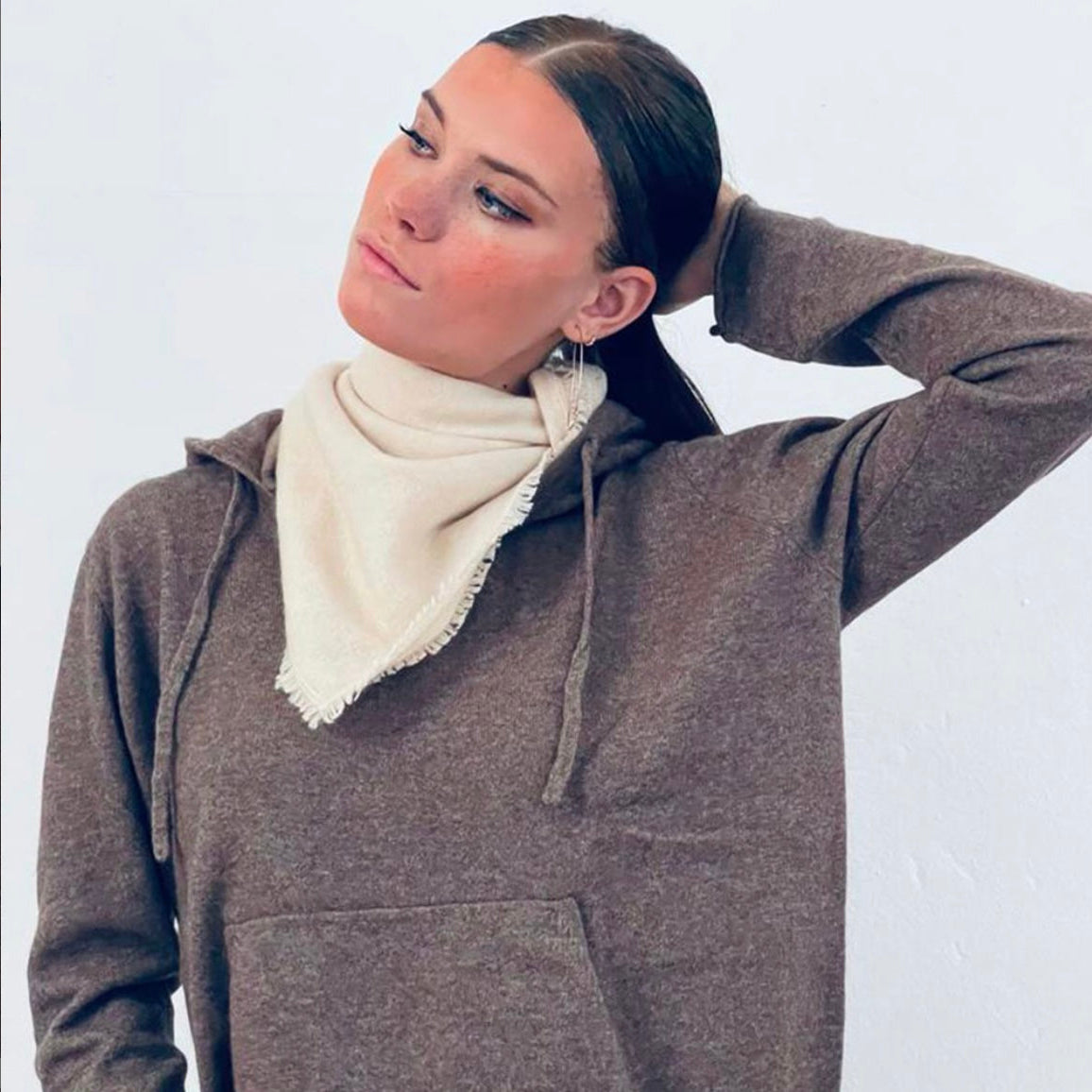 Sa forme carrée et sa taille compacte permettent de le porter aussi bien autour du cou que sur la tête, pour une allure naturellement chic et décontractée.