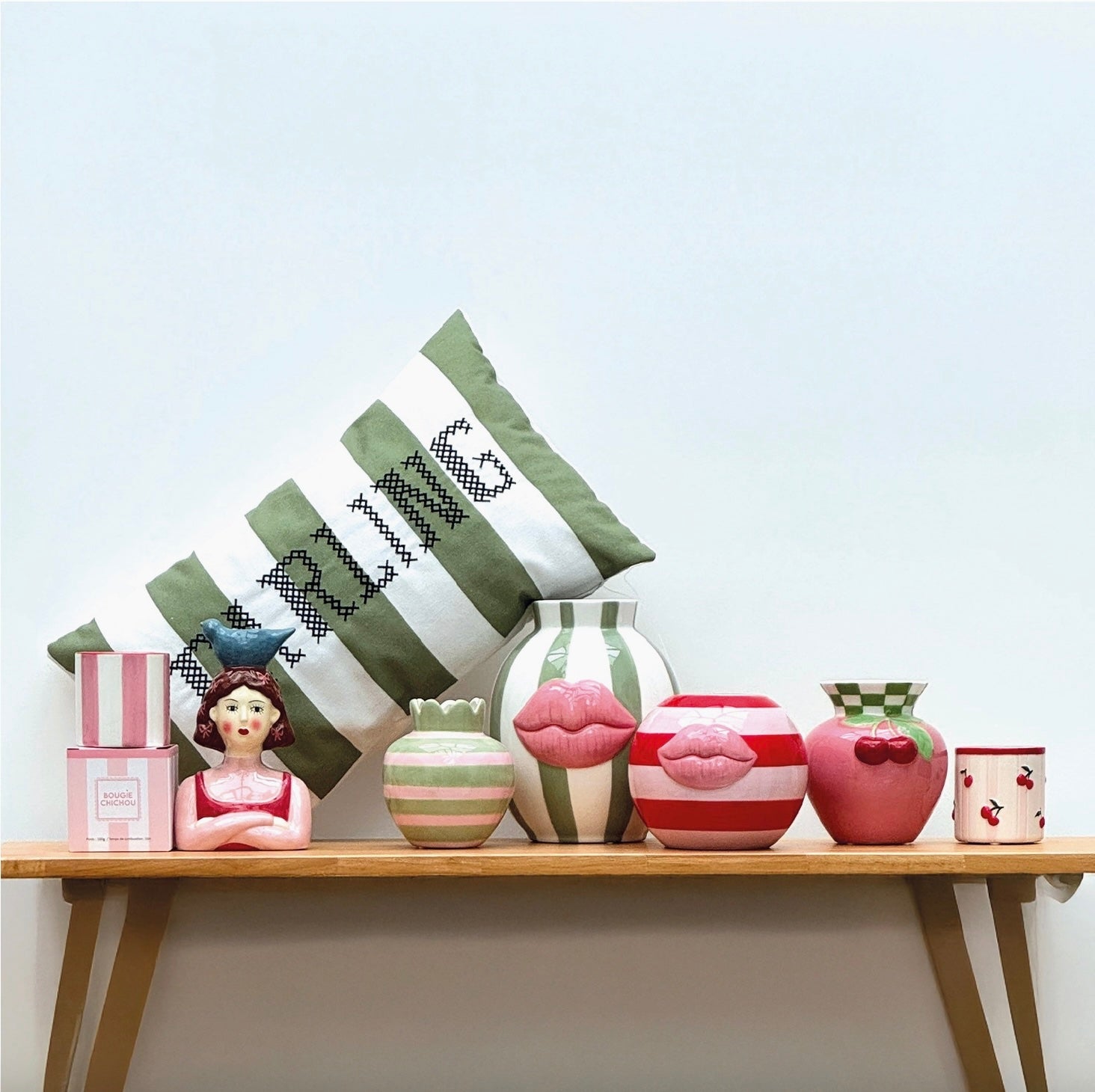 Vase cerise rayures vertes en faïence – Décoration artisanale Slow Life